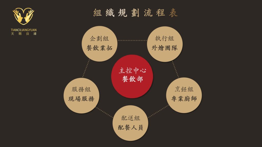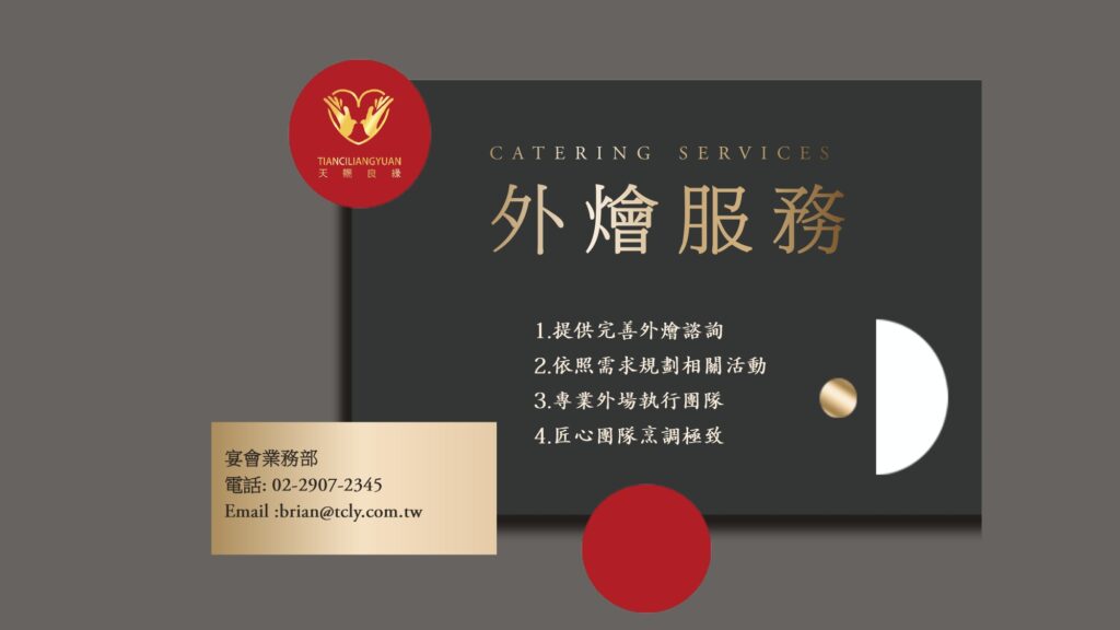{天賜良緣}在新莊區深耕將近8年的時間,同時我們館內也有經營中餐廳,而我們的廚藝團隊曾跟國宴御廚「水蛙師」一起合作過,專攻粵菜及台菜,同時結合在地特色食材。服務團隊主管都是在五星飯店服務過的人員,由五星級酒店外場主管親自培訓的團隊,以嚴謹專業與頂級待客之道,成就卓越服務品質。天賜良緣以最完善的組織規劃,提供最精緻的外燴服務團隊。 起價中式桌菜每桌NT$6000+10%/10人份