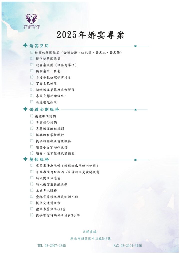婚宴專案 華麗典雅的宴會廳,完整獨立空間保障您們的隱私,充分享受與賓客的相聚時光,婚宴廚藝團隊精心準備的婚宴美饌,為您們帶來不同凡響的味蕾饗宴。婚宴預約諮詢表單 >> 起價中式桌菜每桌NT$15,800+10%/10人份中式素桌菜每桌NT$13,800+10%/10人份