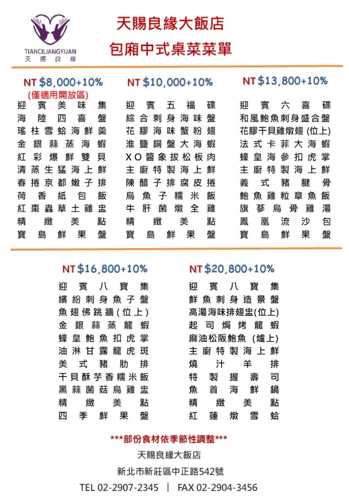 包廂桌菜菜單tclysales2025 年 4 月 20 日美食 有選擇障礙的捧友們看過來~~~這邊桌菜制式菜單都幫您配好囉!!只要直接評估自己預算選擇最適合的價位最喜愛的菜色就好啦~~~ 注意:此菜單價格都是組合優惠價不提供換菜服務!!________________________________天賜良緣大飯店來電洽詢:(02) 2907-2345餐廳位址:新北市新莊區中正路 542 號 上一 文章 2025 母親節專案 下一 文章 2025 寶貝抓周專案
