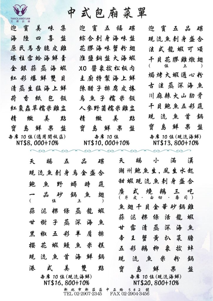 包廂桌菜菜單tclysales2025 年 4 月 20 日美食 有選擇障礙的捧友們看過來~~~這邊桌菜制式菜單都幫您配好囉!!只要直接評估自己預算選擇最適合的價位最喜愛的菜色就好啦~~~ 注意:此菜單價格都是組合優惠價不提供換菜服務!!________________________________天賜良緣大飯店來電洽詢:(02) 2907-2345餐廳位址:新北市新莊區中正路 542 號 上一 文章 2025 母親節專案 下一 文章 2025 寶貝抓周專案