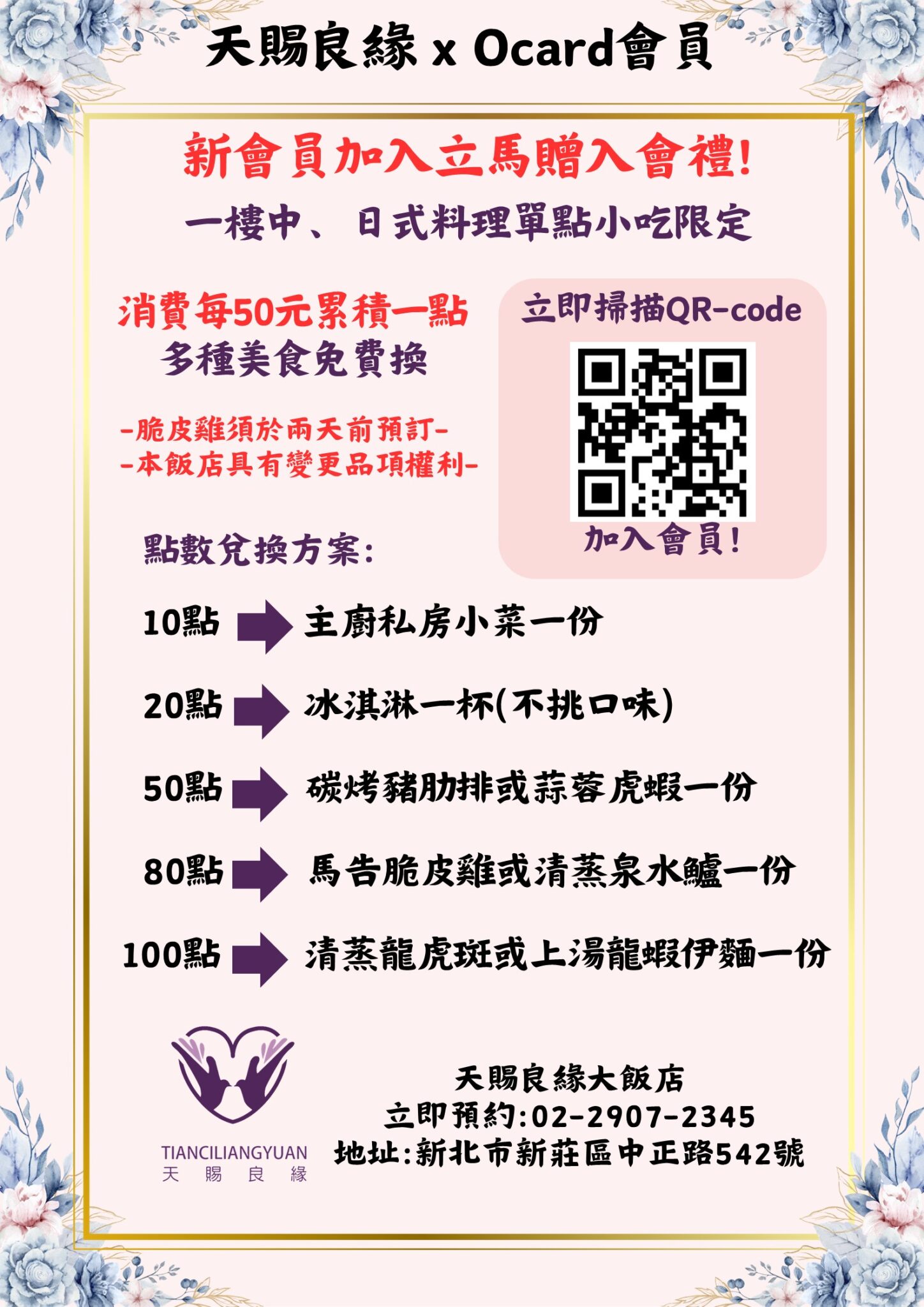加入天賜良緣大飯店會員,於一樓中、日式料理單點小吃消費,消費每NT$50即可累積一點,讓您盡享豐富好禮及優惠。